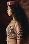 Featuring a blush pink and maroon lehenga in pure tissue and velvet base with floral and geometric embroidery. It is paired with a velvet floral embroidered blouse, a belt and a tissue dupatta. Accentuate it with statement earrings, a sleek low bun, and metallic heels for a dramatic ensemble, ideal for sangeet or wedding ceremonies.