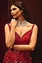 Featuring a red gown in soft net base, adorned with intricate embroidery. Accentuate it with sleek diamond or onyx earrings, a structured clutch and pointed heels for a stylish ensemble, ideal for black-tie evenings or formal galas.