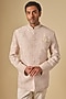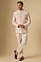 Featuring a champagne bandhgala jacket in raw silk base with embroidery. It is paired with a short kurta, pants, and a pocket square. Ideal attire for sangeet, wedding, or reception ceremony.