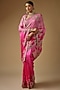 Featuring a pink ombre saree in organza base with zardosi embroidery. It is paired with an unstitched blouse piece. Accentuate it with statement jewellery and heels for a bridal look.