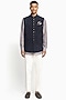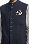 Featuring a midnight blue bundi jacket in matka silk base with metal buttons. Accentuate it with pants, pair of kolhapuris and a bracelet for a wedding or engagement ceremony.