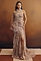 Featuring a nude corset in net base with crystal handwork, embellishments and hand embroidery. It is paired with a skirt and a dupatta. Style it with statement jewellery and embellished heels, perfect for a cocktail, wedding, engagement or sangeet ceremony.