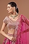 Featuring a pink lehenga in raw silk base with kamdani work. It is paired with a matching embroidered choli and a tulle dupatta.