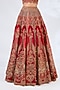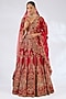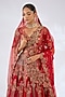 Featuring a red lehenga in raw silk base. It is paired with a blouse, dupatta and a veil. Adorned with heavy jewellery, embroidered wedges and potli bag, the ensemble exudes a majestic bridal charm.