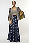 Featuring a blue jacket in tussar base with embroidery. It is paired with an embroidered blouse and wide-leg palazzo pants. Style this set with chandbali earrings, juttis and a clutch for weddings, festive celebrations or traditional family gatherings.