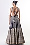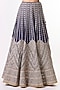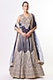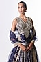 Featuring a navy lehenga in tussar base with motifs embellishment. It is paired with a blouse having a V-neckline and mirror hand work, including an organza embroidered dupatta. Accentuate it with statement kundan or polki jewellery, a sleek low bun or soft waves and embellished heels while draping the dupatta elegantly for a regal ensemble, ideal for weddings, sangeet or engagement ceremonies.