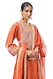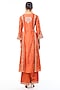 Featuring an orange straight kurta in tussar base with threadwork and embroidery. It is paired with linen satin palazzo pants and a sheer organza embroidered dupatta. Accentuate it with statement jewellery and heels for a festive occasion, wedding or engagement ceremony.