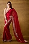 Featuring a red saree in georgette base with mirror embroidery. It is paired with a tussar embroidered sleeveless blouse. Accentuate it with statement earrings and elegant heels for a stylish ensemble, ideal for festive gatherings, sangeet or refined celebrations.