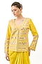 Gopi Vaid features a yellow blazer in tussar base with gold and mirror embroidery. It is paired with an embellished strapless blouse and a crepe draped skirt. Accentuate it with heels and minimal jewellery for a festive evening party, sangeet or haldi ceremony.