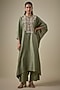 Featuring a green kaftan in silk base with embroidery. It is paired with palazzo pants. Accentuate it with statement earrings and heels for festive occasions.