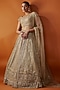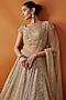 Featuring a gold lehenga in organza base with cutdana and sequins hand embroidery. It is paired with a net floral jaal embroidered blouse and a net dupatta. Accentuate it with statement jewellery and heels for a bridal look.
