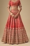 Featuring a red lehenga in raw silk base with zardosi hand embroidery. It is paired with a blouse and two net dupattas. Accentuate statement jewellery and heels for weddings or a bridal look.