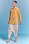 Kalista presents a mustard shirt tunic in silk base with thread, sequins and floral hand embroidery. It is paired with cream viscose dhoti pants. Elevate with metallic heels, subtle gold accessories, and soft curls for effortless grace, perfect for intimate get-togethers, rakhi celebrations, or low-key festive evenings.