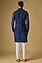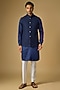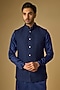 Featuring a cobalt blue bundi jacket in suiting base with cutdana work. It is paired with a kurta. Style it with pants and mojaris for a festive occasion, cultural event, wedding, sangeet or engagement ceremony.