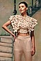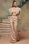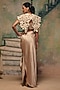 Featuring a white crop top in cutwork lace base. It is paired with a power shoulder cape and metallic jersey champagne flared trousers. Accentuate it with statement jewellery, a structured clutch, and sleek heels for a stylish ensemble, ideal for cocktail or wedding celebrations.