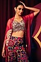 Featuring a multi-colored bralette in organza base with mirror embellishments. It is paired with fluid mosaic printed sharara and a sheer ombre embroidered cape. Accentuate it with statement jewellery, a structured clutch, and sleek heels for a stylish ensemble, ideal for festive occasions, cocktail or wedding celebrations.