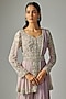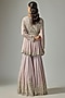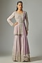 Featuring a lilac peplum in georgette base with pearl and cutdana work. It is paired with sharara, a net dupatta and a belt. Accentuate it with zircon jewellery and embellished heels for a wedding or sangeet ceremony.