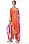 Featuring an orange straight kurta in silk base with motif, zardosi and pearl hand embroidery. It is paired with pure silk straight pants and a pink organza embroidered dupatta. Accentuate it with kundan polki or zircon jewellery and embellished heels for festive celebrations, weddings or sangeet ceremony.