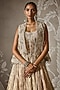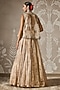 Ridhi Mehra presents a light gold lehenga in tissue base. It is paired with an embroidered blouse and an embroidered sleeveless jacket. Accentuate the designer lehenga set with statement jewellery and heels for your wedding, sangeet or engagement ceremony.