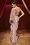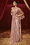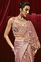 Featuring a dusty pink draped saree in shimmer lycra base with embellishment. It is paired with a net embellished blouse. Accentuate it with pearl or zircon jewellery and embellished heels for a sangeet or wedding ceremony.
