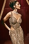 Featuring a rose gold gown in net base with embellishments. Accentuate it with zircon or pearl jewellery, embellished heels and a clutch for a sangeet or cocktail ceremony.