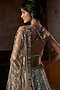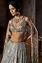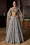 Seema Gujral presents a stunning charcoal grey lehenga in net base with stones and crystal embroidery. It is paired with a blouse having a plunging neckline and an embroidered dupatta. Style this luxurious lehenga with diamond jewellery, a sleek bun and minimal makeup to let the intricate craftsmanship shine, perfect for elite sangeet soirees.
