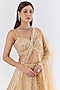 Featuring a gold lehenga in net base with sequins and bugle beads embroidery. It is paired with an embroidered blouse having tassels and a crystal embroidered dupatta. Accentuate it with swarovski or zircon jewellery, embellished heels and a clutch for a cocktail look, Perfect wear for a wedding, cocktail or sangeet ceremony.