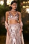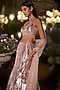 Seema Gujral features a rose gold flared slit skirt in net base with crystal and sequins embroidery. It is paired with an embroidered blouse having a plunge neckline and a net embroidered dupatta. Style it with zircon or silver jewellery, soft curls and embellished heels for your cocktail or sangeet ceremony.