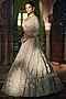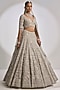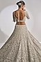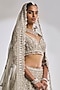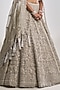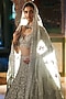 Seema Gujral features a silver lehenga in organza base with zardosi embroidery. It is paired with a matching blouse having tassels and a dupatta. Accessorize it with statement jewellery and heels for a bridal look.