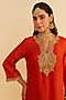 Featuring a burnt orange long kaftan in upada silk base with a zero-neckline, pockets, kiran dori and pearl embroidery. It is paired with dogri salwar pants. Style it with traditional juttis, a potli bag, and statement earrings to complete the ethnic look, ideal for festive gatherings, cultural events, or family celebrations