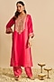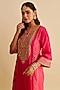 Sheetal Batra presents a hot pink long chauga kurta in pure upada silk base with a zero neckline, three quarter sleeves, aari, sequins, tilla, and pearl embroidery. It is paired with dogri salwar pants having gota and bandhej detailing. Style with kundan jhumkas, soft curls, and dewy makeup for an elegant ethnic vibe, perfect for raksha bandhan celebrations or intimate festive dinners