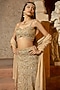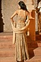 Featuring a beige gold bustier in organza and shantoon base with embroidery and v-hem. It is paired with an embroidered skirt and a dupatta. Accentuate it with polki jewellery and block heels for a sangeet or wedding ceremony.