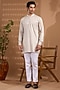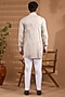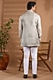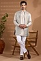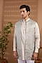 Featuring a grey open jacket in blended silk base with embroidery. It is paired with a cotton satin kurta and white pants. Style it with mojaris for a festive occasion, wedding, sangeet or engagement ceremony.