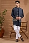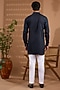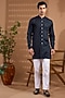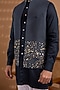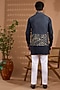 Featuring a navy blue open jacket in blended silk base with foil print. It is paired with a cotton satin kurta and pants. Style it with mojaris for a wedding, sangeet or engagement ceremony.