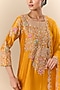 Featuring a mango yellow kurta in spun silk and pure silk base with marori and patch embroidery. It is paired with pants and a dupatta. Style it with polki stud earrings, block heels and an embellished clutch, perfect for diwali celebrations, haldi or cozy family get-togethers.