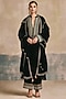 Featuring a black kurta in silk velvet base with golden thread embroidery. It is paired with pants and a dupatta. Style it with chandbali earrings, juttis and a potli bag for festive nights or wedding functions.