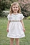 Featuring a white dress in cotton base with a pleated belt, satin flower, lace detailing, and floral print.