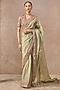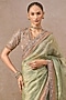 Tarun Tahiliani presents a jade saree in silk tissue base with hand embroidery. It is paired with a hand embroidered blouse. Accentuate the designer saree with kundan polki or emerald jewellery, embellished heels and a potli bag, perfect wear for a wedding or mehendi ceremony.