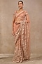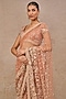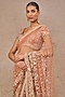 Tarun Tahiliani presents a rust saree in tulle base with pearls, beads, 3D floral and resham embroidery. It is paired with a blouse. Accentuate the designer saree with kundan polki or emerald jewellery, embellished heels and a potli bag, perfect wear for a wedding or sangeet ceremony.