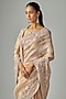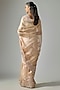 Featuring a peach saree in tissue base with a running blouse.Style it with statement gold jewellery, sleek heels, and a neat bun for weddings, receptions, festive celebrations, and elegant evening occasions.